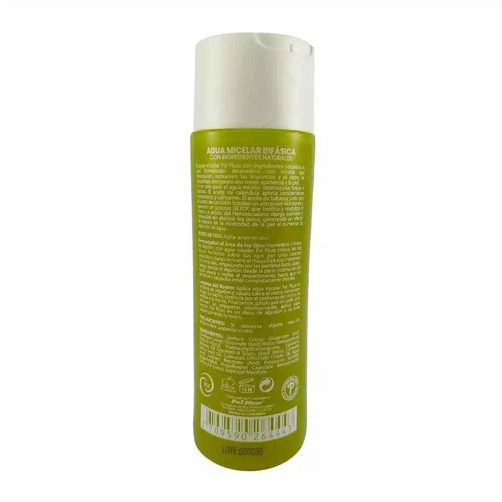 Agua Micelar Pal Pluss es una fórmula bifásica con ingredientes naturales que limpia e hidrata profundamente el rostro. Deja la piel suave, revitalizada y sin impurezas, gracias a sus aceites de caléndula.