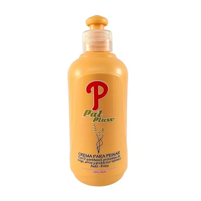 Crema Para Peinar Pal Pluss hidrata, nutre y repara el cabello, ofrece brillo, control anti-frizz, y protección térmica y UV, dejando el cabello suave y fácil de manejar.