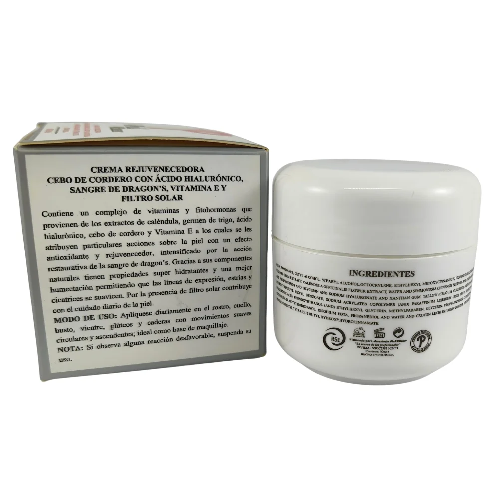 Crema Rejuvenecedora Cebo de Cordero Pal Pluss x1oz, es un complejo de vitaminas y fitohormonas que nutre y protege la piel. Este producto ofrece un efecto antioxidante y rejuvenecedor, suavizando líneas de expresión, estrías y cicatrices, a la vez que proporciona hidratación profunda y cuidado diario contra el sol.
