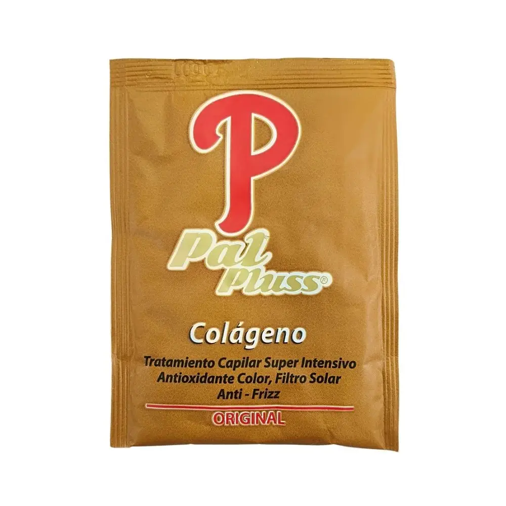 Tratamiento Colágeno Pal Pluss Sobre x30g, es una combinación especial de agentes que retienen la humedad en el cuero cabelludo, previniendo la resequedad. Actúa como antioxidante para mantener la intensidad del color (natural o cosmético) por más tiempo. Sus bioactivos de última generación penetran el folículo piloso, aportando al cabello fuerza, sedosidad, brillo, volumen y vitalidad, además de actuar como anti-frizz.