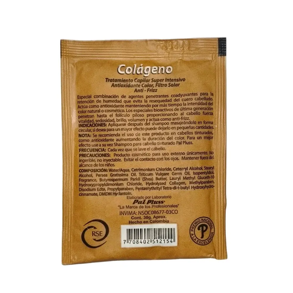 - Aplíquese Tratamiento Colágeno Pal Pluss Sobre x30g después del shampoo.